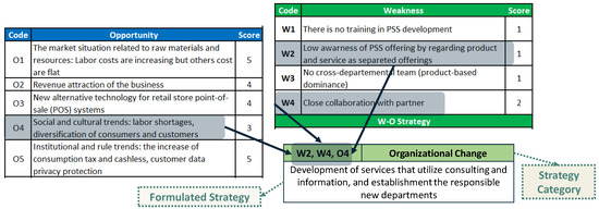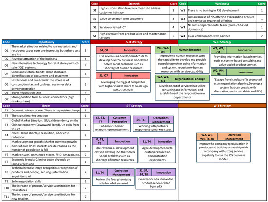 Step 4 is the formulation of service-oriented strategies for servitization. The SWOT matrix [90] is adopted to facilitate the strategy formulation. The company can formulate a strategy by simultaneously considering more than two components listed in the SWOT matrix. For instance, the company utilizes its current strength to improve its weakness and prevent external threats. The proposed method was developed upon the requisite capabilities for servitization. Therefore, the formulated strategies are in the consistent tract with capability development for servitization. A spreadsheet-based supporting tool was also introduced [39] to improve the applicability of the proposal.
