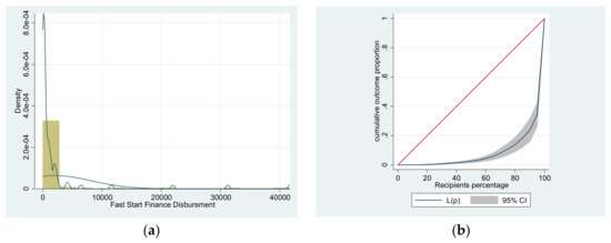 In the previous section, we showed that climate funding is focused on a few countries (Figure 1a). This evidence suggests the use of a quantile regression model [62] to assess whether and how the funding concentration of Fast-Start finance is affected by the impact of anthropogenic activity.