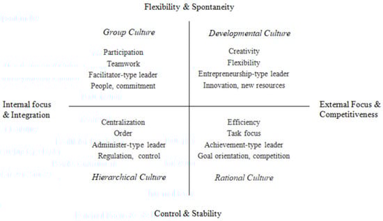 - Denison, D.R.; Spreitzer, G.M. Organizational culture and organizational development: A competing values approach. Res. Organ. Chang. Dev. 1991, 5, 1–21. [Google Scholar]