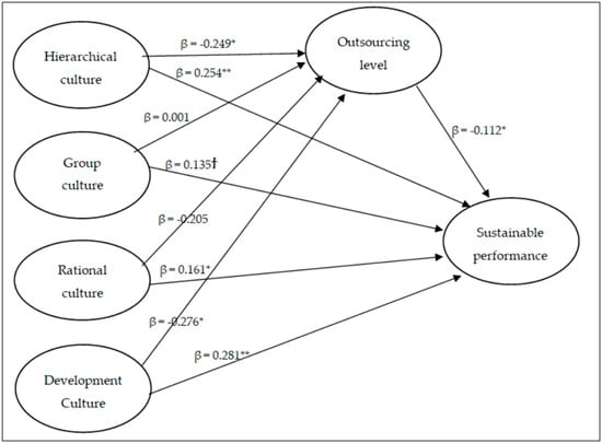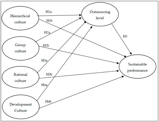 The general objective of this study is to provide a structural model that analyzes the impact of the organizational culture on the level of outsourcing and sustainable performance. To achieve this objective, we used the CompetingValues Framework of organizational culture (CVF) [30]. The CVF was chosen because it has been validated in previous studies and research related to organizational culture, operations management, and sustainability [22,31,32,33].