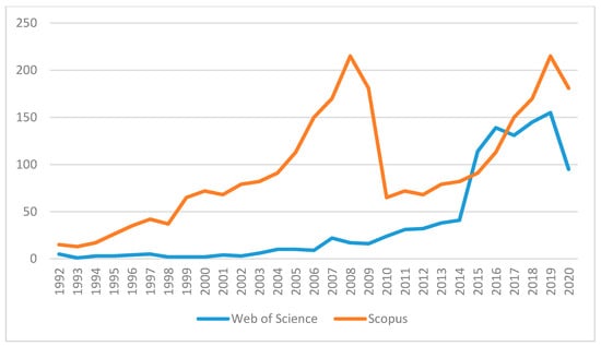 After exploring the main databases in the field of social sciences and humanities, it was found that the number of publications in international journals dealing with religious tourism has grown exponentially. Figure 1 shows the evolution of published papers based on the Web of Science and Scopus if the term religious tourism is searched. A very significant increase occurred after 2014, except for 2008 in the case of Scopus, which exhibited a significative increase, but decreased immediately afterwards. The search can be refined by looking for specific topics, such as pilgrimage, a pilgrim’s or religious tourist’s motivations, and impacts, among others. Figure 1 demonstrates the importance this field has acquired in the last year as a topic of academic interest.
