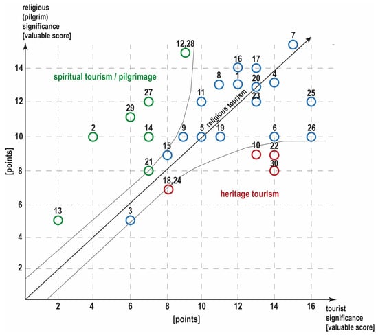 The third and final stage of research included a comparative analysis of the attractiveness and tourist and religious significance of individual objects. The authors believe that a comparison of the attractiveness and significance of the analyzed places, together with the motivation of pilgrims (tourists) travelling there, allows for the distinction of specific groups of destinations differentiated by their perception—spiritual tourism, religious tourism, and heritage tourism. According to the concept of the spiritual sustainability of destinations presented in this publication, the visitor’s motivation and the authentic, intangible religious influence of the place are the most significant factors impacting its perception as an important and symbolic sacred space. However, in order to assess its attractiveness for religious tourism, these factors must be balanced by those related to tourist development (accessibility, service and information, interpretation offered, etc.). The presentation of this balance and its interpretation to highlight places with a great potential for spiritual experience, as well as to indicate places with high values related to their cultural or touristic features, has become the main aim of this stage of research. This stage is therefore the final result of the two previous ones and forms the basis for building a model defining the character and perception of sacred spaces in tourism lining spiritual sustainability and tourism accessibility.
