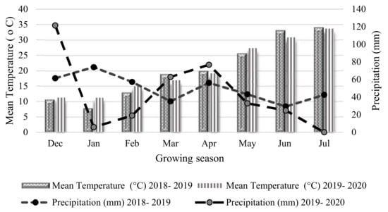 Meteorological Data at Experimental Area for Growing Seasons 2018–2019 and 2019–2020. The Total Precipitation Was 399 MM and 343 MM, Respectively, for Two Seasons.
