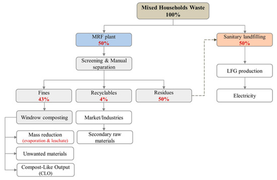 The amount of MSW produced per capita in Shiraz is assessed to be 0.645 kg per day. The main ratio of MSW is collected as mixed and low fractions of dry waste, which are segregated at source. The informal sector affects the MSW stream significantly, and it is estimated that half of the dry valuable waste is collected by them. Half of the collected mixed waste is subjected to material recovery, and the remaining half is landfilled directly (Figure 1). The disposal method is sanitary landfilling, and the landfill’s trenches are equipped with a Landfill Gas (LFG) collection system. LFG is used for electricity production at the biogas power plant.