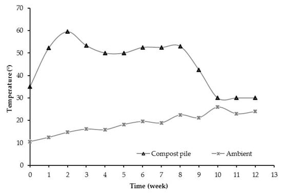 The oxidation of carbon sources by microbial activities produces abundant energy in form of heat during the decomposition process [21,22]. The temperature fluctuation is considered a proper indicator for an efficient composting process [23]. In this study, the temperature was monitored daily (Figure 2). The temperature rose to the thermophilic phase (>50 °C) in the first week, and reached to its highest level by the seventh day. This displays accurate initial conditions in the experimental pile. The rapid change in the temperature profile during the first week also indicates an extreme reduction in the organic matter [23]. During the active decomposing phase (the first three weeks), more temperature fluctuation was observed, which consequently required more turnings to maintain the process in the sanitation phase. The requirement for sanitation; the elimination of pathogens, insects, larvae and weed seeds by reaching the temperature ≥60 °C for more than 2 weeks was fulfilled [24,25]. The composting process of different organic materials took place over 10 weeks [26,27]. The lack of rises in temperature from the eighth week onwards confirmed the decreasing microbial activities. The temperature nearly reached the ambient from week 10, which proves the curing phase.