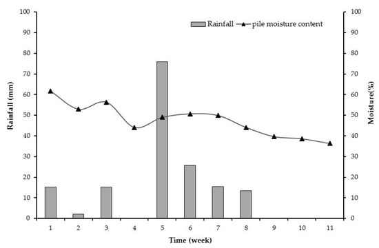 During the initial phase of this experiment, there was no leachate production. It was assumed that water was only lost through evaporation. This was due to the fact that the composting process was carried out under optimal conditions, with a well-blended pile structure (mixing ratio). Moreover, the mild weather in winter during the composting process period inhibited the generation of leachate. The active decomposition rate in the initial weeks lead to the reduction of the moisture inside the pile. The moisture content was kept close to 50% throughout the active decomposition process until the tenth week (Figure 3). In addition, 163 mm rainfall during the composting experiment (February to June 2019) provided the pile adequate moisture content.
