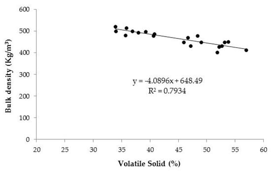 The bulk density is an indicator for the mass of the material within a specified volume [32]. It defines the quantity of the compost that can be placed at a certain site, as well as the machinery size for its transportation [33]. The waste within the composting pile achieves a higher bulk density by the end of the decomposition process [34]. The stabilization of organic materials leads to the enhancing of the ash content in such a manner that less volatile solids remain. Figure 4 displays the scatter diagram of the relationship between the bulk density and the volatile solids during the composting trial. As it shows, a significant negative correlation was found.