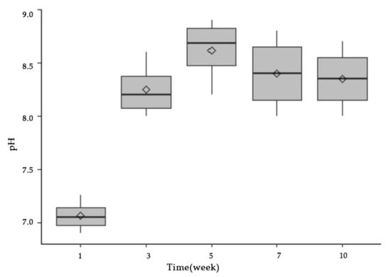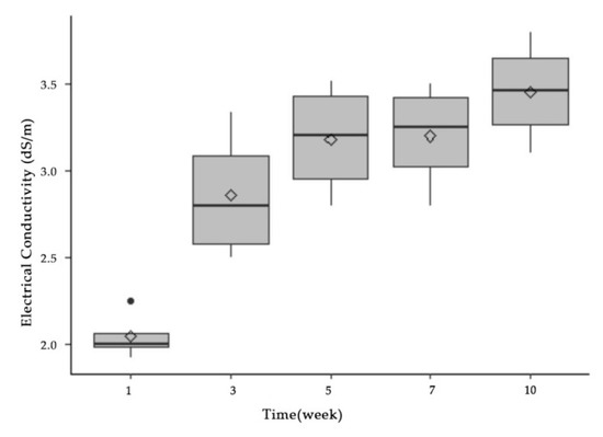 The degradation of organic materials by the soluble salts released by the microbial activity during the composting process consequently increases the EC value [33]. Over the composting period, the EC slowly increased to be around 3.18 dS/m, and this range remained more or less stable until the end of the process, resulting in a final EC of 3.36 dS/m after 10 weeks (Figure 6). Compared to the preferred range of EC values for the growth medium, 2–4 dS/m, the final product has a high potential to be used as a soil conditioner [34].