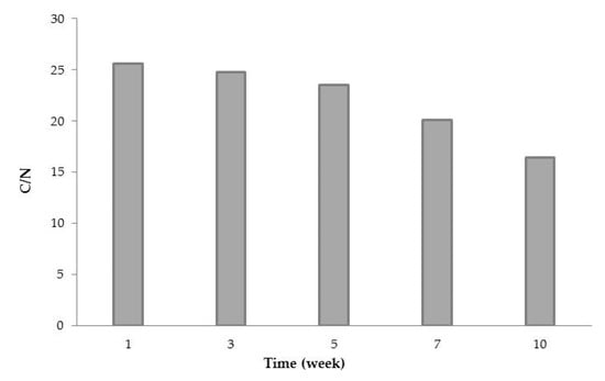 The relative proportion of carbon and nitrogen is one of the major parameters in controlling the nutrient balance in the composting process [22]. Carbon acts mainly as a source of energy for the microorganisms. The population growth of bacteria is influenced by the nitrogen fraction, because their structure is mainly formed from proteins [38]. The ideal range for the stimulation of nitrogen immobilization or mineralization in the composting process falls in the initial substrate of about a 25 to 35 C/N ratio [42].