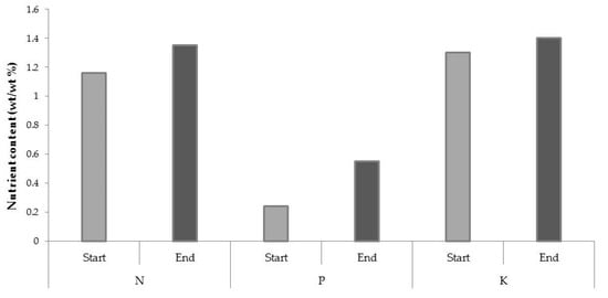 From an agricultural point of view, the fertilizers should provide the soil with essential nutrient elements to support the crops’ development stages. Nitrogen (N), Potassium (K2O), and phosphorus (P2O5) are the macro nutrient elements that significantly affect the plant growth. Usually, small parts of nutrients are mineralized by microbial activity over the period of the composting, resulting in the higher nutrient content of the final product [43]. In this research, the concentrations of the total N, K2O and P2O5 was measured to be 12%, 7%, and 33% higher in final product, respectively (Figure 8).