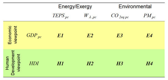 The second set of indicators has been named set H. It is analogous to the previously introduced set E, with the difference that, all the variables above considered—the total primary energy supply (), the exergetic losses due to the energetic chain (), the greenhouse gases emissions () and the particulate matter emissions ()—have been divided by the Human Development Index, . In this way, the reference indicator () is directly related to human well-being and is not a purely economic reference indicator. Thus, the set H can be written as follows: