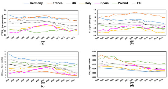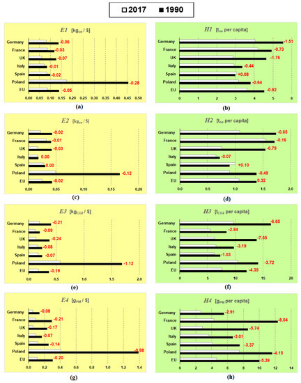 Therefore, we have considered the two following different sets of indicators. The first set has been named set E, which is characterised by considering as a reference quantity a purely economic one: the gross domestic product per capita, (at purchaser’s prices in constant 2011 US$ [66]).The set E is represented by the following equations (Equations (4)–(7)):