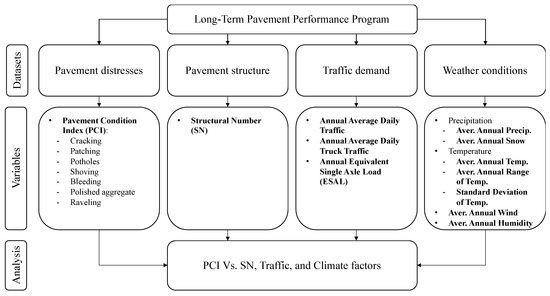 The research method is displayed in Figure 1, summarizing the dataset, the variables, and the analysis. The study was based on four datasets: (i) pavement distresses; (ii) pavement structure; (iii) traffic demand; and (iv) weather conditions. All these datasets were downloaded for free from the Long-Term Pavement Performance (LTPP) program web site (https://infopave.fhwa.dot.gov/). The Pavement Condition Index (PCI) of every road section was calculated considering pavement distresses. Likewise, the Structural Number (SN) was estimated using the AASHTO method (AASHTO 1993). Different traffic and climate variables were proposed and estimated for each road section. Finally, the PCI was analyzed considering pavement age, SN, some traffic parameters, and various climate factors as explanatory variables so as to determine the influence of pavement structure, traffic, and weather on pavement deterioration process. To do this, two complementary analysis were proposed: (i) correlation analysis, which allowed the identification of the relationships among the studied variables; and (ii) regression analysis, which was focused on the calibration of regression models to understand and determine the effect of the predictive parameters—pavement structure, traffic, and climate factors—on the performance parameter PCI.