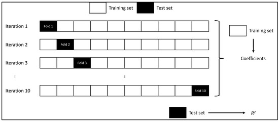 The selection of k is critical when using this technique. A high value of k leads to less biased model, but large variance might lead to overfit, whereas a low value of k is similar to the train-test split approach used in a conventional regression. In other words, the value of k should not be too small or too high, being recommended to use a value of 10 [39]. Therefore, the dataset of this research was divided into ten folds. In this way, a total of 10 sub-models were developed to calibrate a unique model (Figure 2). The equations presented in the following sections show the average values of the regression coefficients, estimated from training sets, and the coefficient of determination, calculated from test sets.