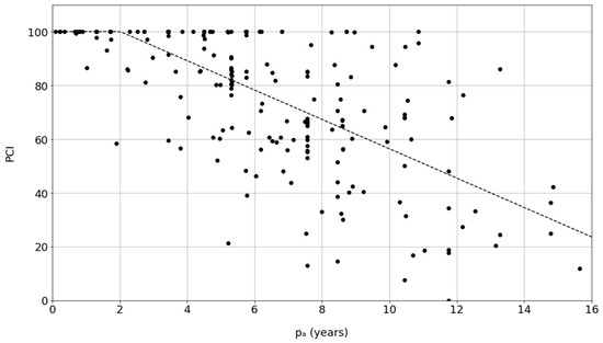 The main factor in pavement deterioration process, which is considered a stochastic phenomenon, was pavement age (pa). Although this study considered road sections characterized by very different traffic and climate conditions, pa was able to represent the pavement deterioration process properly. The relationship between PCI and pa was modeled through Equation (2) that describes a linear decrease of PCI over time; Figure 3 plots the data. Specifically, the PCI of a road section decreases approximately 5 units per year from the first year and a half of its construction.