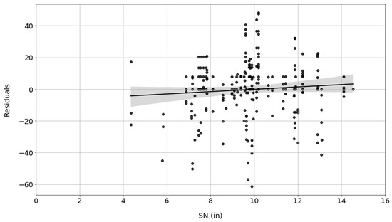 The influence of pavement capacity is studied from the Structural Number (SN). As discussed previously, this parameter did not show correlation with the PCI and traffic loads. To determine the impact of the pavement structure on pavement deterioration process, the residuals of the previous model (Equation (2)) were studied considering SN (Figure 4). This analysis showed that pavement capacity does not have a significant impact on the studied phenomenon because the residuals are homoscedastic and approximately rectangular-shaped.