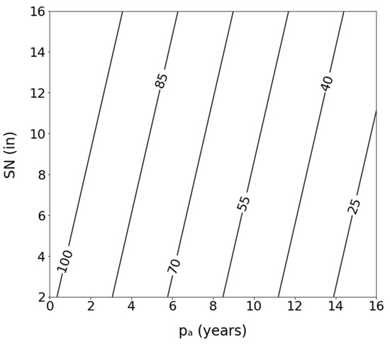 The Structural Number (SN) of a pavement is a numerical value that indicates pavement strength and capacity. In this way, pavement structural capacity is greater as SN increases. According to the AASHTO method [35], this parameter is estimated by Equation (1).
