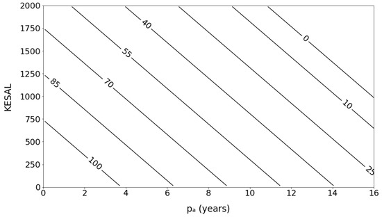 Particularly, KESAL, which is used by the AASTHO for designing pavement layers, resulted in the most influential traffic factor. Thus, a combined model was calibrated considering this variable together with pavement age (Equation (4)). This model describes a reduction in PCI as KESAL increases, i.e., pavement condition worsens as heavy traffic takes on importance; this is shown in Figure 6.