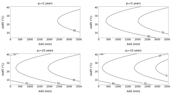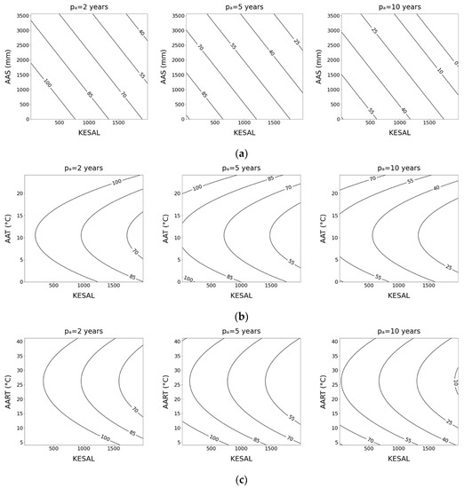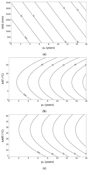 Therefore, the inclusion of climatic factors in pavement condition assessment led to a more accurate estimation of the PCI and a better understanding of the phenomenon. Specifically, the impact of weather conditions on pavement deterioration process resulted in an increase in the explained variability between 7% and 8%. Due to the parabolic relationship between temperature variables (AAT and AART) and pavement condition, the 3D representation of Equations (6) and (7) would be a parabolic surface whose projection in a 2D graphic results in parabolic contour lines (Figure 7b,c).