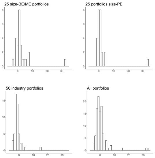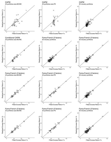 We use the monthly series referred to above to generate three sets of portfolios, which constitute our test assets. First, we form 25 size-BE/ME portfolios following a procedure analogous to that suggested by []. Specifically, at the end of June of each year, we allocate all stocks to quintiles based on their market equity, and, analogously, we allocate stocks in an independent sort to five BE/ME groups. Size-BE/ME portfolios are determined as the intersections of the size and BE/ME groups. We calculate value-weighted returns on a monthly basis using the market equity at the beginning of each month to determine the portfolio weights. Second, we form 25 size-PE portfolios using the same methodology. Third, we form 50 industry portfolios using two-digit SIC codes. Finally, we determine the Fama–French factors in an analogous way, following the methodology described in [,]. All the return data for the portfolios and factors under consideration are publicly available at [].