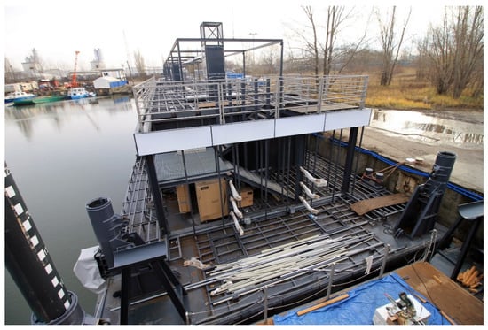 The Floating Terminals, built in Warsaw in 2017, are hybrids between ships and buildings in many aspects. They were designed in civil and naval offices, built by a shipyard and building contractors, and were used in fixed locations despite their status of a vessel [68]. The hull design follows the regulations of the Polish Register of Shipping and the superstructure design follows the Polish building code. The structure as a whole meets Inland Waterways Navigation Rules (Figure 8).