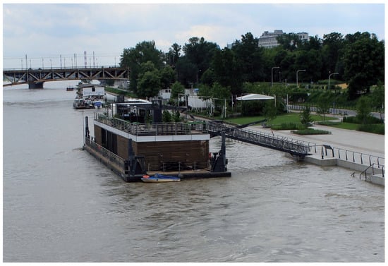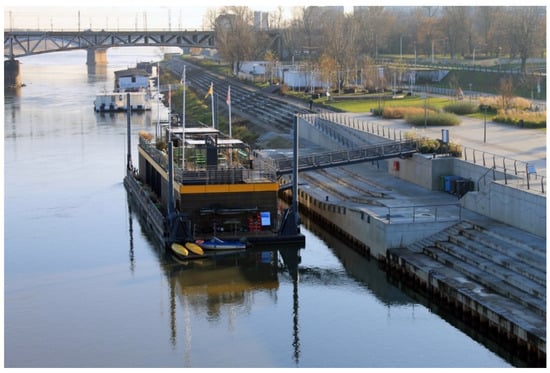 Floating terminals in Warsaw, a model example of the new trend in the catering and water tourism industry in Poland [70], turned out to work more like a vessel than the building. They are the only mobile structures in the study. In Warsaw, the floating concept seems to be exploited to its limits: due to very high water level variations, land access to the terminals is limited, especially during very low and very high waters. On the cost of very complicated operation and maintenance, they complement the infrastructure of the boulevards where other flood-resilient strategies were impossible to implement.