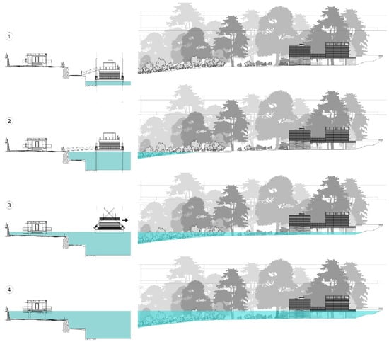 The flood-performance comparison of three flood resilient strategies in the context of Warsaw riverbanks (from left to right): amphibious pavilion, floating terminal, and elevated beach pavilion during different water levels: (1) low water (55 cm), (2) high water (600 cm-warning stage), (3) 20-year flood (780 cm), and (4) extremely high flood (950 cm, water reaches the flood barrier). All water levels referring to gauging station Warszawa Bulwary (Source: processed by the authors).
