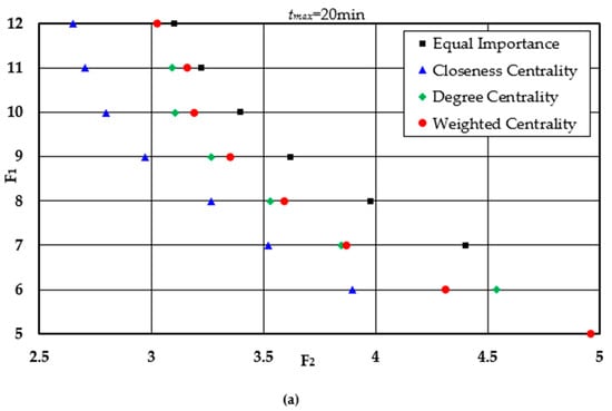 Result analysis: We can observe that the minimum F1 decreases with tmax increase from Figure 3a–c. Specifically, the minimized under ; the minimized when ; and the minimized when . However, in Table 1, the variation law of D, , and caused by tmax changes is different from the minimized F1. D, , and can be reduced only under an appropriate tmax constraint, as in the scenario ; An unreasonable tmax will increase the value of the above three indicators. For instance, under the same value of the objective function F1, D2 in the scenario is the shortest; it is 4.48% less than D3 on average and 8.96% less than D1. Meanwhile, and in this scenario are minimal.