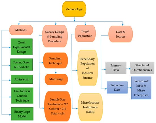 We employed a mixed-method approach (Figure 1) to achieve the research objectives, e.g., to investigate the impact of financial inclusion on mountain community living standards, this study used the Quasi-Experimental Designs (Post-tests with Experimental and Control Groups) method. To analyse the impact of financial inclusion on economic and multidimensional poverty, Foster, Greer and Thorbecke measures of poverty and the Global Multidimensional Poverty Index methodology developed by Sabina Alkire were adopted, respectively. To capture income inequality among treatment and control groups, the Gini Index and Quintile technique were used. To determine major drivers of economic and multidimensional poverty in the study area, this study adopted the Binary Logistic Regression technique. The target population for this study consisted of the Microfinance Institutions (MFIs) operating in the Karakoram mountainous region of Pakistan as well as the inclusive finance beneficiaries of these MFIs. As far as survey design and sampling technique are concerned, we surveyed 424 households (212 each from beneficiary and non-beneficiary households of inclusive finance) through structured questionnaires using multistage sampling technique. Sample size was determined using Yamme sampling determination formula. The detailed description of the abovementioned methodological procedure is given below.
