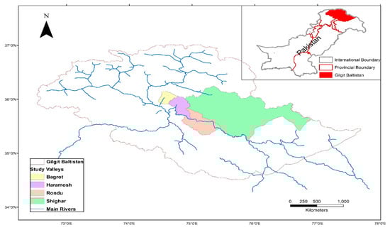 The target population for this study consisted of the microfinance institutions operating in the Karakoram valleys of Pakistan as well as the inclusive finance beneficiaries of these institutions. We used ArcGIS software (Esri, Redland, CA, USA) to show the study valleys in Figure 2 given as follows: