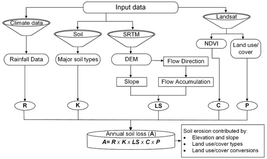 In this study, the overall methodology involved the use of the GIS-based Revised Universal Soil Loss Equation (RUSLE) modelling approach. RUSLE is an empirical modelling approach that is commonly used to compute long-term surface erosion, mainly gross sheet and rill erosion [2,46]. The model was developed through modification of the USLE to improve on accuracy in estimation of soil loss [28]. The annual soil loss using the RUSLE model is computed as:
