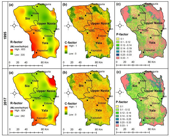 Spatial distribution of: (a) rainfall-runoff erosivity (R-factor) (b) cover management (C-factor); and (c) conservation practice (P-factor) for the years 1995 and 2017.