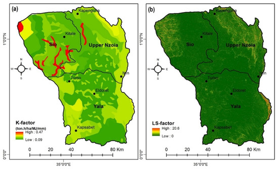 Spatial distribution of: (a) soil erodibility (K-factor) and (b) topographic (LS-factor).