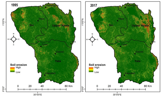 Soil loss was further classified into different soil erosion severity classes namely: low (less than 5 t/ha/y), moderate (5–10 t/ha/y), high (10–20 t/ha/y) and very high (>20 t/ha/y), as shown in Table 4. The areas that experience low erosion rates were dominant in the study area, covering 614,756 ha (with average soil loss of 0.2 t/ha/y) and 611,581 ha (with average soil loss of 0.4 t/ha/y) in the years 1995 and 2017, respectively. In the year 1995, the areas that experienced moderate erosion (6.8 t/ha/y), high erosion (13.5 t/ha/y) and very high erosion (31.5 t/ha/y) were 2788 ha, 1031 ha and 385 ha, respectively. In the year 2017, areas that experienced moderate erosion (6.7 t/ha/y), high erosion (13.4 t/ha/y) and very high erosion (35.8 t/ha/y) were 5188 ha, 1697 ha and 493 ha, respectively. The highest increase in soil erosion by 4.3 t/ha/y was observed in areas prone to very high erosion rates.