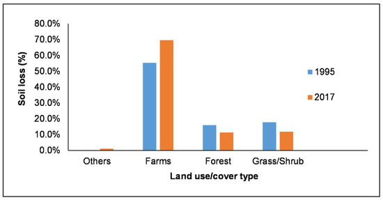 Distribution of soil loss in different LULCs showed that farms had the highest occurrence of soil erosion; 55.3% and 69.6% in the years 1995 and 2017, respectively (Figure 7). Soil loss in grass/shrub lands was 7.9% in 1995 and 11.9% in 2017. The other land cover that had significant soil loss were forested areas where 16% and 11.4% of soil erosion occurred in the years 1995 and 2017, respectively.