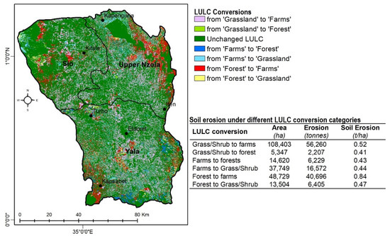The spatial distribution of the LULC conversions and their contribution to soil erosion is presented in Figure 8. The major form of LULC change was conversion of 108,103 ha of grass/shrub land and 48,729 ha of forestland to farms, leading to total soil loss of 56,260 tons and 40,696 tons, respectively. Other conversions were 5347 ha of grassland and 14,620 ha of farms to forest. In addition, 37,749 ha of farms and 13,504 ha of forest were converted to grass/shrub land. The highest soil erosion rates of 0.84 tons/ha and 0.52 tons/ha were realized in the conversion of forest and grass/shrub lands to farms, respectively.