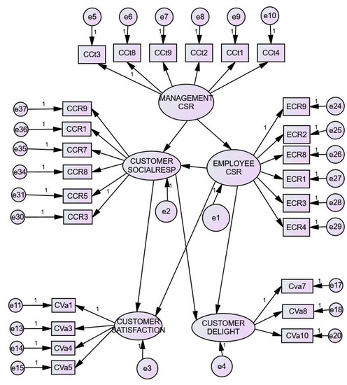 Management and employees at the LUX resorts were sent the questionnaire and requested to participate in the study. The data collection was effected in 2016; the questionnaire was distributed through the Human Resource Departments. Completed questionnaires were deposited at central collection points. Respondents were assured of complete privacy. The greater the participation the more likely the greater representativeness of the sample. Studies show that CSR activities are better understood theoretically and tested empirically when they are organized by stakeholder types [121,166]. Firstly, questions were included in order to select front line employees, that is, those who are in direct contact with the guests during service delivery. Then employees who are in managerial positions were also requested to provide their perceptions. Thirdly, a sample of hotel customers was surveyed with a questionnaire that was distributed by the receptions. This was a shorter questionnaire to solicit larger response rate. Their responses were used as the dependent variables of interest to this study to minimize CMV. Structural Equation Modelling (SEM), a robust statistical technique [167,168], was employed to test the hypotheses. The measurement and the structural models were tested. The structural component of SEM tests the hypothesized relationships [169].