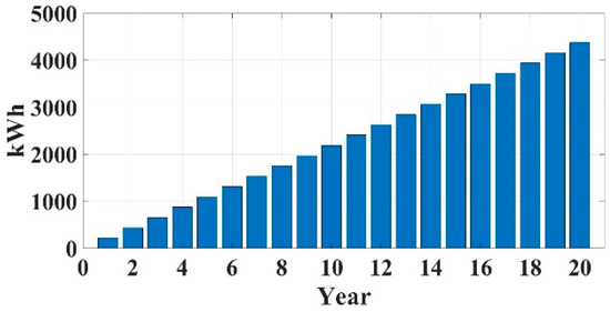 Table 1 lists the population for San Cristobal Island, the number of power contract households, and the number of cars and motorcycles. In the calculations, there are several assumptions that are described as follows. First, electric cars and motorcycles have 25 and 3 kWh batteries, respectively. Second, considering the battery capacity of vehicles and low daily mileage on the island, the electric cars are charged once every three days, and the electric motorcycles are charged once every two days. Third, every year, 5% of conventional vehicles will gradually change to EVs. Figure 1 shows the daily EV charging energy requirements by project year. In the final project year, the daily power demand of EVs reaches approximately 4379 kWh.