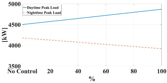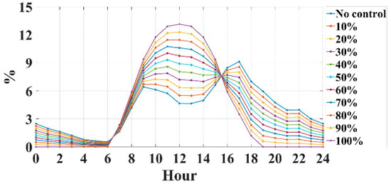 Fourth, the power system operator or local government can control the EV charging load using their own methods, such as the EV purchase support policy or the charging electricity billing systems. Figure 2 shows the daily EV charging patterns. As shown in Figure 2, typical EV charging loads, denoted by “No control”, which is from the advanced research on EV charging loads of the Nordic region [26], vary according to the owner’s life pattern, as the typical daily load. As the control stage increases, the EV charging load pattern becomes similar to the solar power generation pattern. Although the EV charging load patterns are different, there are integral values for the eleven lines in Figure 2, which implies that the total required energy is the same. These charging curves can be calculated as: