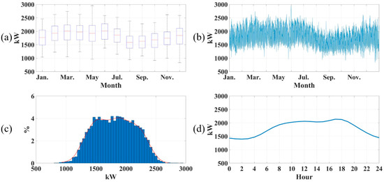 Load data of an example island: (a) Boxplot, (b) Time series plot, (c) Histogram and distribution, and (d) Average daily time series plot.