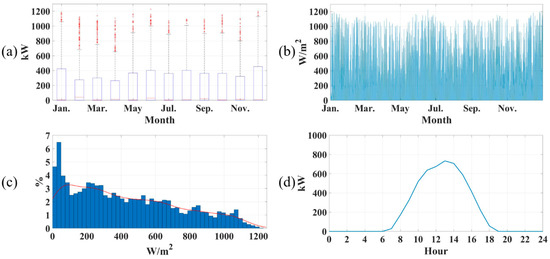 Solar radiation data of an example island: (a) Boxplot, (b) Time series plot, (c) Histogram and distribution, and (d) Average daily time series plot.