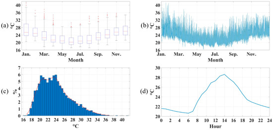 Temperature data of an example island: (a) Boxplot, (b) Time series plot, (c) Histogram and distribution, and (d) Average daily time series plot.