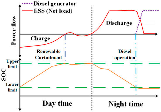 EMS is essential for the stable operation of a microgrid. Its main purpose is to prevent over-charging and -discharging of the battery. Figure 6 shows simplified EMS logic that can determine the operation of the diesel generator and renewable curtailment. In this logic, the ESS supplies and absorbs power based on the net load when the SOC is within a stable range. If the SOC is above the upper limit, the renewable energy sources are curtailed. Under the lower limit of the SOC, the diesel generator supports the demand load. The final PV output power, including curtailment, diesel operation, and the capacity of the diesel generator can be expressed as [28]: