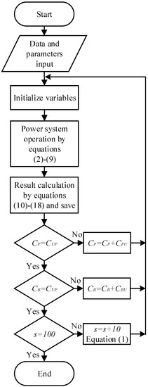 In Equations (11) and (12), is the remainder operator to calculate the value of the remaining life of the facilities and is the round down operator for calculating the replacement cost of equipment, respectively. From the power flow result and cost functions of Equations (2)–(14), LCOE, renewable energy sharing rate, renewable energy curtailment rate, and CO2 emissions are calculated by Equations (15)–(18). These results are used to verify the effect of EV charging demand control.
