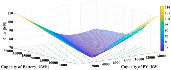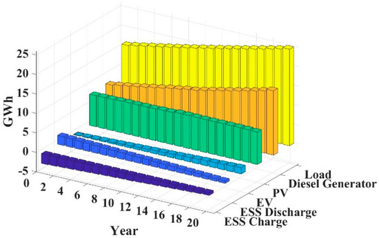 Figure 8 shows the results of the capacity calculation when the EV charging demand control was not performed. The PV and battery capacities that minimize the overall cost were determined to be 6200 kW and 8500 kWh, respectively. Furthermore, the minimum cost at the optimal point was calculated as USD 72.06 million. Figure 9 shows the results of the power system operation over the 20-year period of the project. It can be confirmed that the output of the diesel generator increased as the PV output degraded and the power load increased. It can be seen that the utilization rate of ESS also gradually decreases as the load increases.