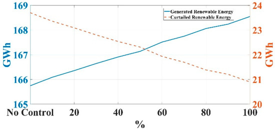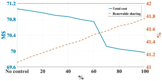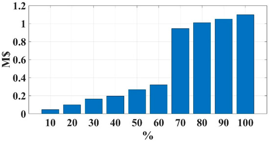 Table 3 lists the total cost, renewable energy sharing rate, renewable energy curtailment rate, and CO2 emissions when the same capacity is applied as the result value for each scenario. As the EV charge demand control ratio increased, the total cost gradually decreased, thereby increasing renewable energy sharing and reducing curtailment. The renewable sharing and curtailment in Figure 10 increase and decrease almost linearly; however, the total cost rapidly decreases when the EV charging load is controlled by 70%, as shown in Figure 11. This phenomenon occurs when the required diesel generator capacity decreases and proves that the charging load control reduces the peak load in the evening without PV output as represented in Figure 12. The increase in the peak contribution of PV generation reduced the peak load in the evening, thus avoiding overdesign of diesel power generation. Due to these results, the proposed design initially predicted a linear operating cost reduction, but it was confirmed that the installation and management cost of the diesel generator can be reduced through the shift of the peak load. Figure 13 shows the difference between the total cost of not meeting the charging demand control and the total cost of each scenario, which is the advantage of the EV charging demand control. These advantages can be used by central or local governments to facilitate the spread of EVs, or they can be used for the costs required to control the charging loads, such as monitoring, and the proceeds of EV owners from tariff adjustments. The microgrid, which was the test model of this study, could reduce the total cost by approximately USD 1.1 million, which is 1.52% of the total cost when 100% of the charge load control is achieved. This would give all the 938 EV owners a USD 1172 benefit. Renewable energy sharing increased by 1.7% compared to no control, which was 2.8 GWh. In addition to the above-mentioned advantages, the annual capacity factor of PV rose from 19.07% to 19.39%. Furthermore, the annual renewable curtailment rate was reduced from 12.51% to 11.01%. This can be expected to improve the efficiency by about 1.5% compared to when not controlled.