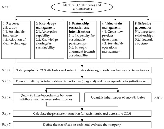 The main outcome of the proposed framework is the Collaborative Capabilities for Sustainability Index (CCSI), which determines the level of collaborative capabilities a company has achieved when it comes to sustainability. To obtain the CCSI, the framework is divided into seven steps (Figure 1), considering the attributes and sub-attributes we selected from the literature and following the methodological steps of GTA [22].