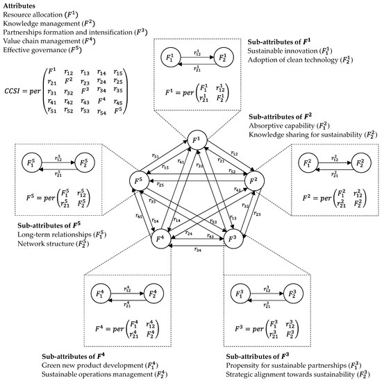 The value of an attribute is given by the permanent of the matrix composed of its sub-attributes. For example, the sub-attributes , and their interdependencies will provide the value of the attribute F1 (Figure 2). Similarly, the permanent of the matrix composed of the attributes F1, F2, F3, F4, and F5 and their interdependencies will provide the value of the entire system, i.e., the CCSI. However, it is noteworthy that the interdependencies in the matrix of attributes should be assessed with the scale in Table 2, since they cannot be obtained from the lower level matrices.