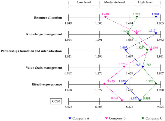 The last step of the assessment framework is dedicated to classifying the company according to the achieved level of CCS. However, it is necessary first to build a scale for that. Thus, we replaced the diagonal values of the sub-attributes matrices with the best- and worst-case situations to determine the highest and the lowest possible value for the CCSI and each attribute. In consonance with the scale in Table 3, a zero-diagonal matrix will generate the lowest permanent possible, while a nine-diagonal matrix will provide the highest permanent. Alongside setting upper and lower bounds, we selected intermediate thresholds to set out different levels of CCS. Therefore, diagonals were replaced by values 0, 3, 6, and 9, which delimited three levels: low, moderate, and high.