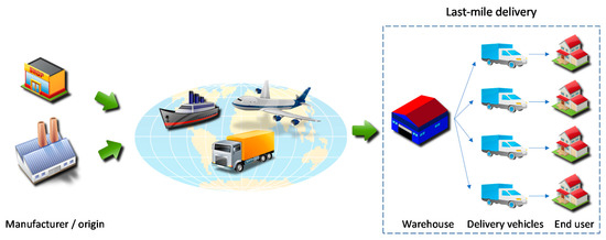 In general, while the logistics associated with freight transport have significantly improved in recent years, this cannot be stated for last-mile distribution, which is considered one of the least efficient, the most polluting and the costliest segments along the entire logistics chain [6]. Last-mile delivery is the process associated with moving goods from a courier’s warehouse to their final destination [7]. Figure 1 represents a traditional parcel delivery model. Goods are transported from their place of origin by different transportation means until they reach the courier’s local warehouse, which is usually located near the customer’s address. From this point with traditional last-mile delivery, goods are loaded on delivery vehicles that travel around the city in order to deliver the corresponding parcels to customer addresses.